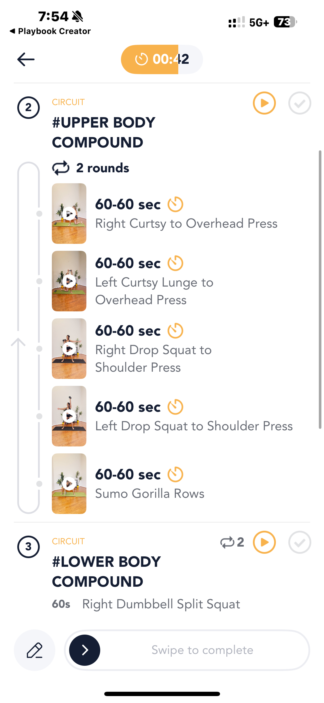 Daily splits that rotate upper body, lower body, full body, and core for balanced progress and recovery.